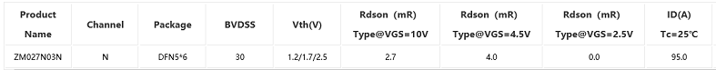 真茂佳ZM027N03N 30V 2.7mR Vth1.2/1.7/2.5 馬達電機N溝道MOS管,可用于筋膜槍、電動工具等市場應用;