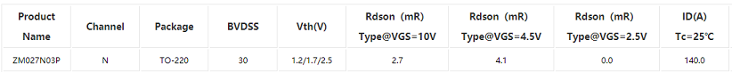 ZM027N03P TO-220 30 ±20 1.2/1.6/2.5 2.7/3.6 4.1/5.5 - - 140