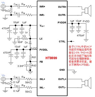 HT8699具有AB類和D類的自由切換功能,在受到D類功放EMI干擾困擾時,可隨時切換至AB類音頻功放模式。