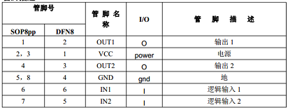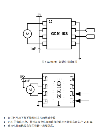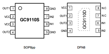 GC9110 是一款低壓 5V 全橋驅動芯片,為攝像機、 消費類產品、 玩具和其他低壓或者電池供電的運動控制類應用提供了集成的電機驅動解決方案。GC9110 能提供高達 1.3A 的持續輸出電流。 可以工作在 1.2~7V 的電源電壓上。GC9110 具有 PWM(IN/IN) 輸入接口,與行業標準器件兼容, 并具有過溫保護功能。GC9110S 是 SOP8pp 封裝, GC9110D 是DFN 封裝。