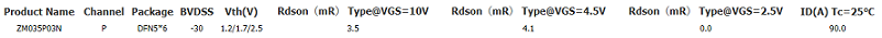 真茂佳ZM035P03N -30V 3.5mR Vth1.2/1.7/2.5 馬達電機P溝道MOS管,可用于筋膜槍、電動工具等市場應用;