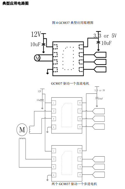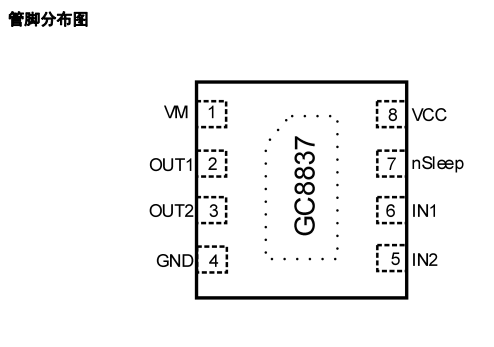 芯片描述GC8837 是一款 12V 直流電機驅(qū)動芯片,為攝像機、 消費類產(chǎn)品、 玩具和其他低壓或者電池供電的運動控制類應用提供了集成的電機驅(qū)動解決方案。 芯片一般用了驅(qū)動一個直流電機或者使用兩顆來驅(qū)動步進電機。