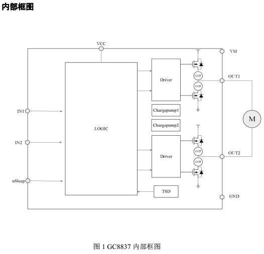 GC8837 具有 PWM( IN/IN) 輸入接口,與行業(yè)標準器件兼容, 并具有過溫保護功能。芯片集成了過溫保護, 欠壓保護, 短路保護, 過流保護等功能。