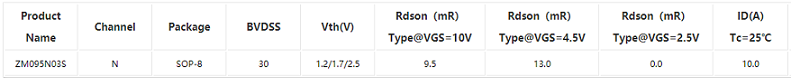 ZM095N03S SOP-8 30 ±20 1.2/1.6/2.5 9.5/12 13/18 - - 10