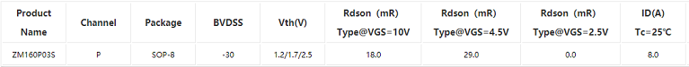 真茂佳ZM160P03S-SOP8 -30V 18mR Vth1.7 P溝道電機驅動MOS管 真茂佳一級代理商 完全替代新潔能、后羿、銳駿,可用于筋膜槍,電機驅動,無線充,電子煙,鋰電保護,PD快充,DCDC車充等市場應用;