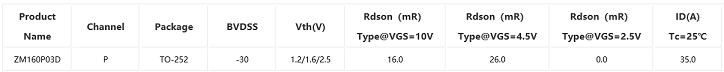 真茂佳ZM160P03D -30V 16mR Vth1.2/1.6/2.5 馬達電機驅動P溝道MOS管,可用于筋膜槍,電動工具等市場應用;