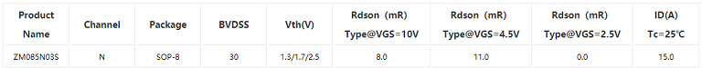 ZM085N03S SOP-8 30 ±20 1.2/1.6/2.5 8.5/11 12.5/16 - - 15