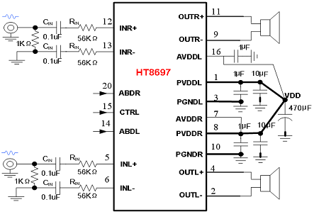 HT8697可實(shí)現(xiàn)AB類和D類的自由切換功能,在受到D類功放EMI干擾困擾時,可隨時切換至AB類音頻功放模式。