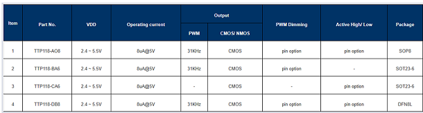 TTP118-AO8 可用於單通道觸摸直流LED燈光調節(jié)控制晶片 TTP118-AO8 可用於單通道觸摸按鍵控制晶片。提供穩(wěn)定的“單通道觸摸按鍵”檢測效果可以廣泛的滿足不同的應用需求且可在有介質隔離保護的情況下實現(xiàn)觸摸 功能,安全性高(如玻璃,亞克力等材質)。此觸摸檢晶片是專為取代傳統(tǒng)按鍵而 設計,觸摸檢測 PAD 的大小可依不同的靈敏度設計在合理的範圍內,低功耗與寬 工作電壓,是此觸摸晶片可在DC或AC應用上的特性,電源及手機干擾特性好。