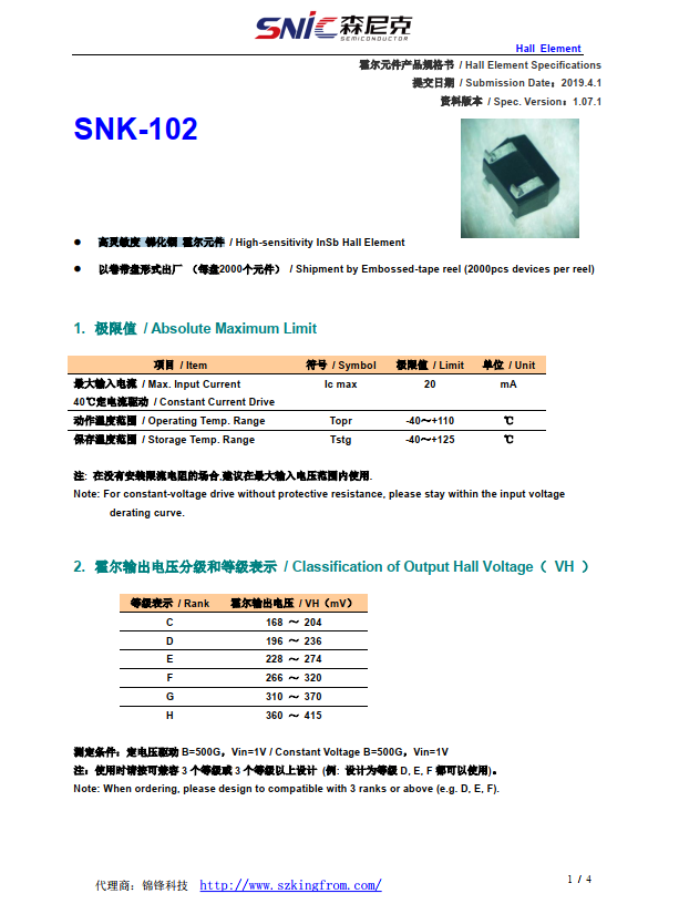 SNK-102國產替代HW-102A/SH-22A/NHE522TU高靈敏度 銻化銦 霍爾元件