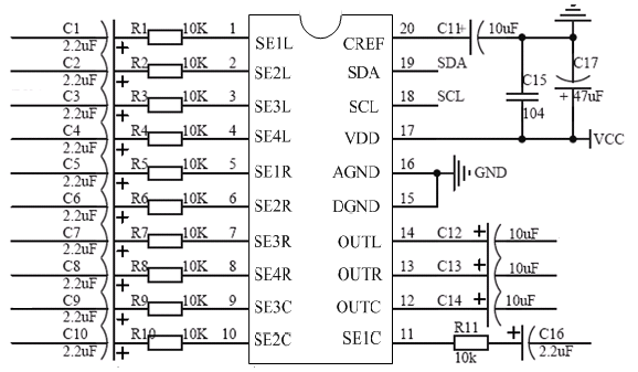 AiP1116是一款專為便攜式音響設計的高性能的2.1聲道電子音量控制電路。它是一個三通道的電子音量控制電路,采用I2C串行控制,可對三個通道的音量分別進行0~-77.5dB、每級1dB衰減范圍進行控制。三個通道的輸入含多路選擇器,輸入增益可進行0/10dB放大。電路含混音功能,可將2.0聲道轉化為2.1聲道。