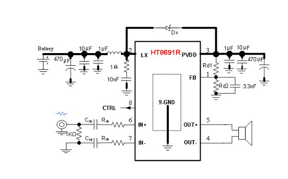 HT8691R具有AB類和D類的自由切換功能,在受到D類功放EMI干擾困擾時,可隨時切換至AB類音頻功放模式。