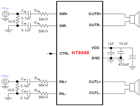 HT8696具有防削頂失真(ACF)輸出控制功能,可檢測并抑制由于輸入音樂、語音信號幅度過大所引起的輸出信號削頂失真(破音),顯著提高音質,創造舒適聽音享受,并保護揚聲器免受過載損壞。同時芯片也具有ACF-Off 模式可配置。