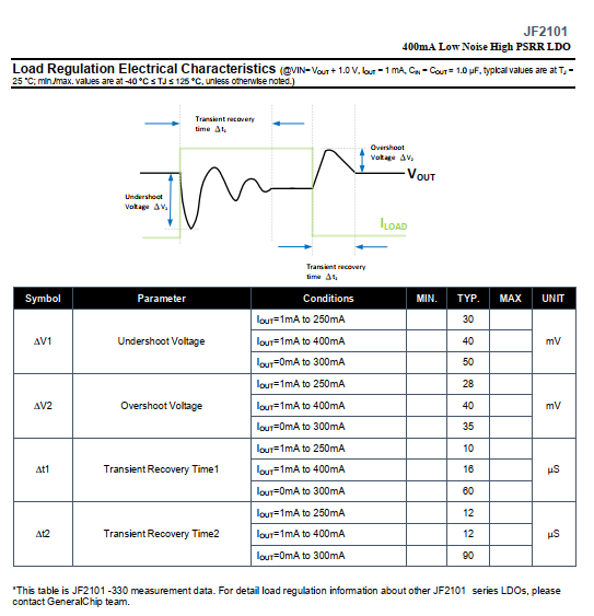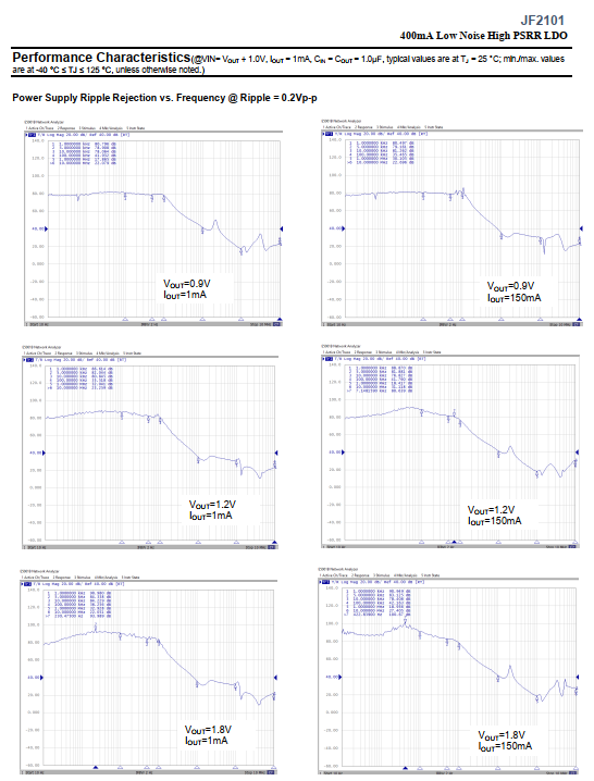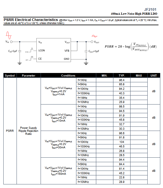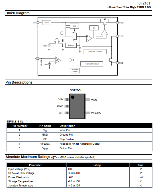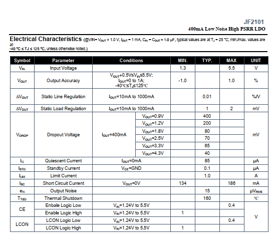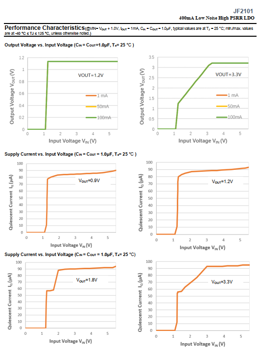 DescriptionThe JF2101 series is a CMOS-based positive low-dropout linear regulator (LDO) featuring 400mA that provides high PSRR, high output voltage accuracy, fast load regulation, lownoise and low supply current.
