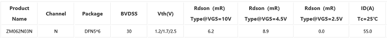真茂佳ZM062N03N 30V 6.2mR Vth1.2/1.7/2.5 馬達電機N溝道MOS管,可用于筋膜槍、電動工具等市場應用;