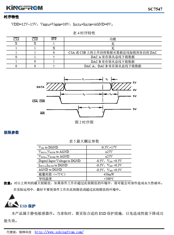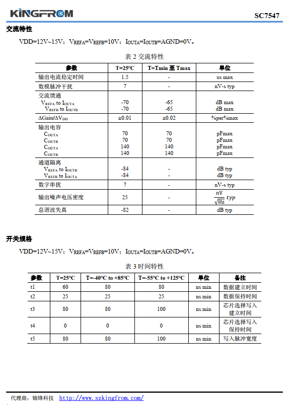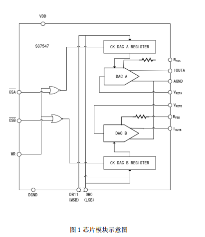 SC7547 總共有 12 個數據輸入口。 CSA, CSB, WR 接口控制 DAC 選擇和裝載。數據在上升時被鎖存到 DAC 寄存器中。 SC7547 的運算速度兼容的大多數微型處理器,接受 TTL, 74HC 和 5VCMOS 邏輯電平輸入。SC7547 使用四象限乘法作為計算方式,并且配置有單獨的參考輸入和反饋電阻。單片結構保證了熱誤差和增益誤差蹤跡表現良好。保證兩個 DAC 工作在合理的溫度范圍內。