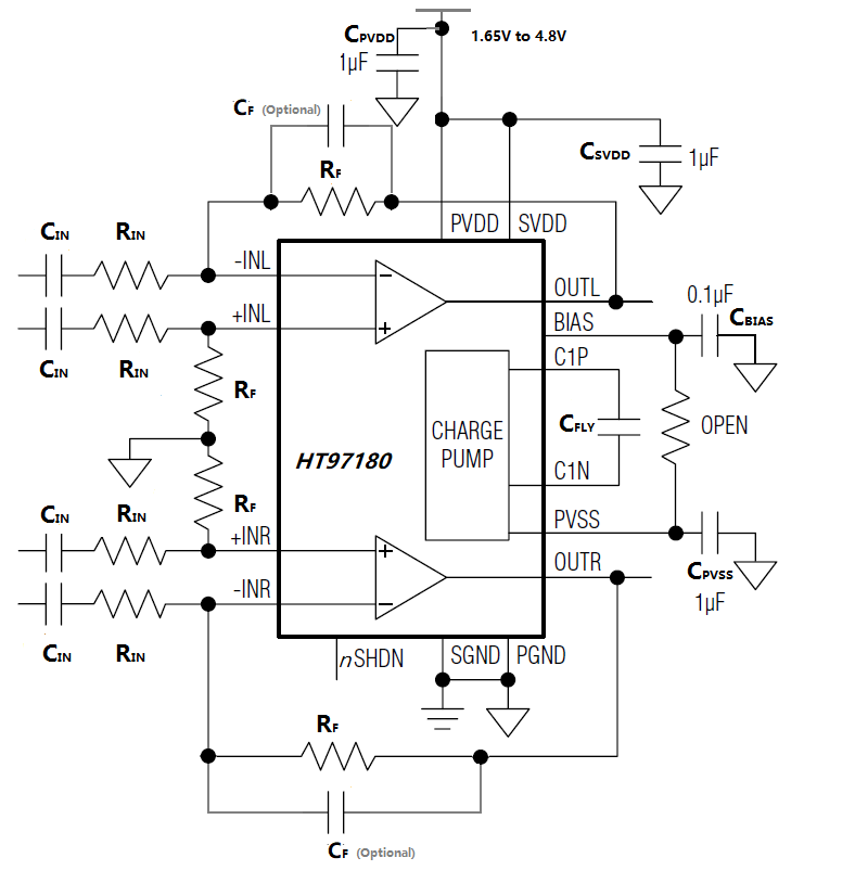 HT97180為差分輸入、可直接輸出的耳機放大器。4.2V供電時,器件為32Ω耳機負載提供125mW驅動。IC可以通過外部電阻調整增益。