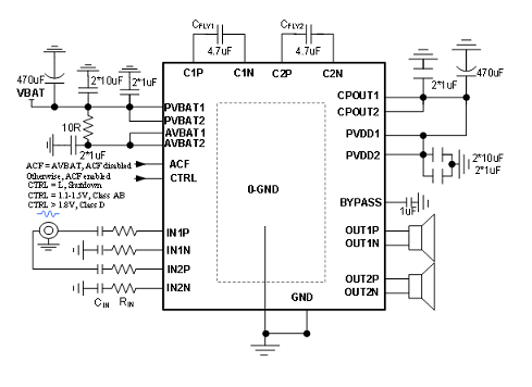 HT8320具有AB類和D類的自由切換功能,在受到D類功放EMI干擾困擾時,可隨時切換至AB類音頻功放模式(此時電荷泵升壓功能關閉)。