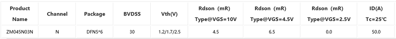 真茂佳ZM045N03N 30V 4.5mR Vth1.2/1.7/2.5 馬達電機N溝道MOS管,可用于筋膜槍、電動工具等市場應用;