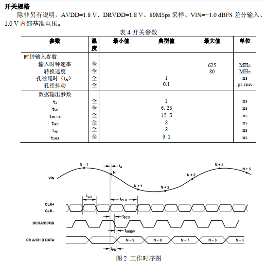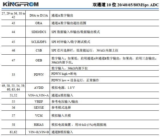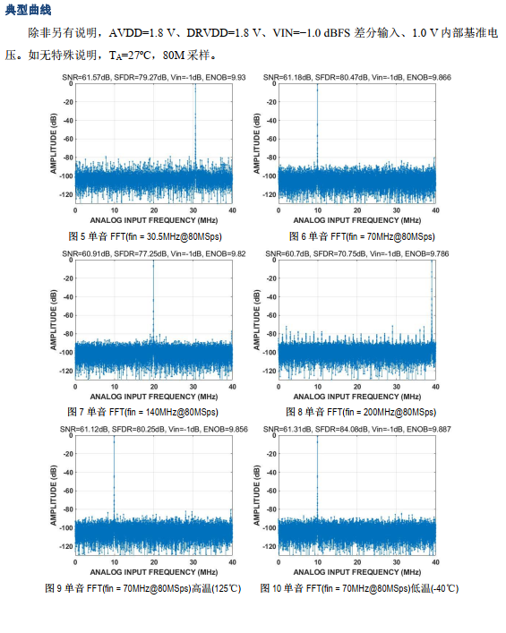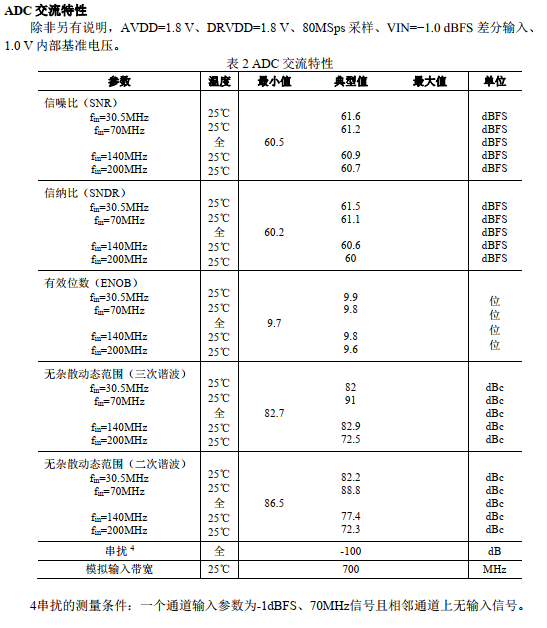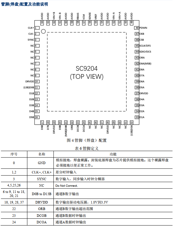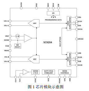 SC9204 是一款單芯片、雙通道、 10 位、 20MSPS/40MSPS/65MSPS/80MSPS 模數轉換器(ADC),采用 1.8V 電源供電,內置高性能采樣保持電路和片內基準電壓源。該產品采用多級差分流水線架構,內置輸出糾錯邏輯,在 80 MSPS 數據速率時可提供 14 位精度,并保證在整個工作溫度范圍內無失碼。該 ADC 內置多種功能特性,可使器件的靈活性達到最佳、系統成本最低,例如可編程時鐘與數據對準、生成可編程數字測試碼等??色@得的數字測試碼包括內置固定碼和偽隨機碼,以及通過串行端口接口(SPI)輸入的用戶自定義測試碼。采用一個差分時鐘輸入來控制所有內部轉換周期。數字輸出數據格式為偏移二進制、格雷碼或二進制補碼。每個 ADC 通道均有一個數據輸出時鐘(DCO),用來確保接收邏輯具有正確的鎖存時序。該器件支持 1.8V 和 3.3V 兩種 CMOS 電平,輸出數據可以在單條輸出總線上多路復用。