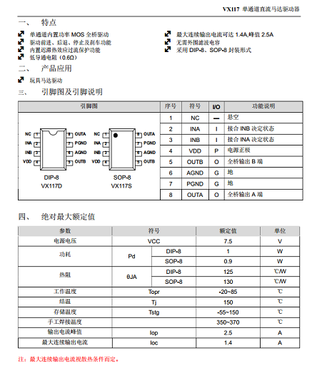 VX117 單通道直流玩具、電動牙刷馬達驅(qū)動芯片IC 完全替代MX118 無需要更改外圍