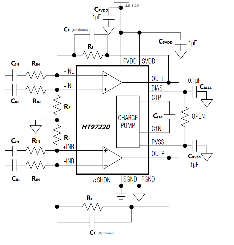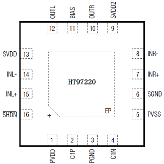 HT97220為差分輸入、可直接輸出的線路驅動器/耳機放大器。5V供電時,器件為32Ω耳機負載提供125mW驅動。IC可以通過外部電阻調整增益。