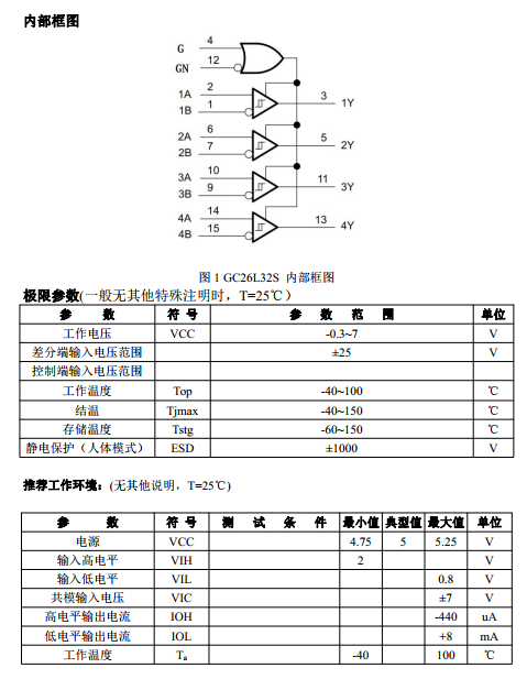 GC26L32S 是一款低壓 5V 四通道差分線路接收芯片, 可接收差分平衡和非平衡數(shù)字?jǐn)?shù)據(jù), 使能控制端可同時(shí)控制四路接收,切 G 為高電平有效, GN 為低電平有效。 輸入在開路狀態(tài)時(shí), 輸出高電平。GC26L32S 采用 SOP16 封裝。