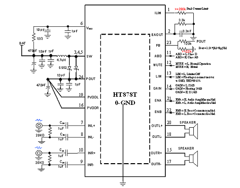 HT878T是一款內置自適應升壓的立體聲D類音頻功率放大器,由鋰電池供電升壓至VPOUT=8.3V時, THD+N=1%、1kHz信號條件下,能連續輸出2×6.8W功率(4Ω負載);另外,其還支持AB類模式。
