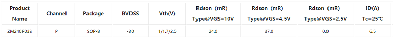 真茂佳ZM240P03S-SOP8 -30V 24mR Vth1.7 P溝道電機驅動MOS管 真茂佳一級代理商 完全替代新潔能、后羿、銳駿,可用于筋膜槍,電機驅動,無線充,電子煙,鋰電保護,PD快充,DCDC車充等市場應用;