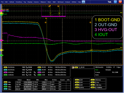 圖3為雜散電感為0.82 μH時的現(xiàn)象:輸出由300V擺動至0V,負壓尖峰最小峰值為-127V且保持148ns。經(jīng)過幾次的切換,沒有任何損壞或者運轉(zhuǎn)失常。