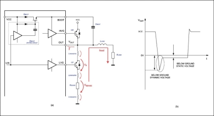 在半橋拓撲結(jié)構(gòu)中,特別是驅(qū)動大感性負載時,功率半橋的輸出很容易出現(xiàn)負壓,表現(xiàn)為初始的動態(tài)尖峰和后續(xù)的靜態(tài)負壓(如圖1-b所示)。這個現(xiàn)象出現(xiàn)在橋臂硬開關(guān)切換至低電平輸出且負載電流由橋臂輸出至負載時。當(dāng)高側(cè)開關(guān)關(guān)閉時,感性負載元件試圖維持輸出電流恒定。輸出電壓逐漸降低且當(dāng)其降低至“地”電平值時,電流開始經(jīng)低側(cè)續(xù)流二極管續(xù)流,該二極管正向?qū)ā討B(tài)負壓主要是由于與半橋低側(cè)電流路徑續(xù)流二極管串聯(lián)的PCB板子上寄生電感引起的高dI/dt而造成的尖峰。另外,動態(tài)負壓還與低側(cè)續(xù)流二極管的正向尖峰電壓(其在短暫時間內(nèi)由高壓反向狀態(tài)切換到正向?qū)顟B(tài))和分流電阻的寄生電感有關(guān)。