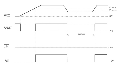 欠壓鎖定(UVLO)機制監(jiān)控驅(qū)動器供電電壓的輸出變化,并在該電壓降低至低于預(yù)設(shè)閾值時將輸出關(guān)斷。該保護可防止驅(qū)動器在電源電壓較低時驅(qū)動功率管(這將導(dǎo)致導(dǎo)通損耗過高甚至損壞功率管)。