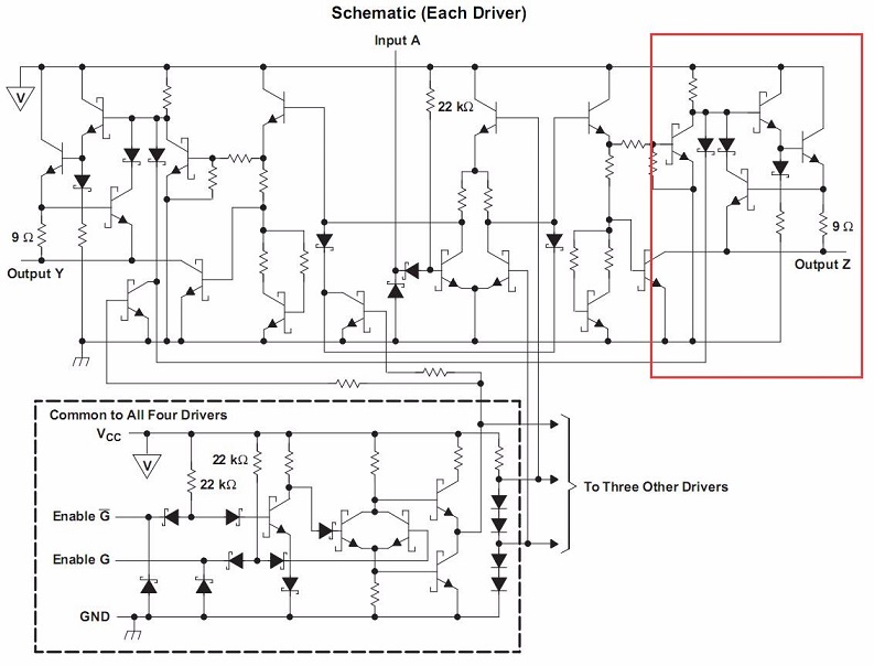 差分驅動的輸出信號電壓(在VCC=5V時)沒有達到預期的5V,而只有3.3V左右。這其實是芯片的正常輸出電壓,是為了兼容3.3V的接口系統。從芯片的內部電路結構(圖1)也可以看出,Y、Z輸出是在晶體管的射級,自然不可能達到芯片的供電電壓。