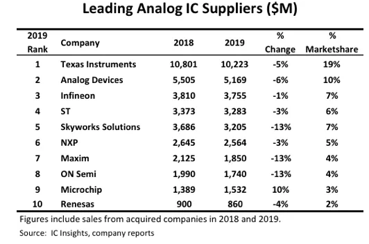 日前,國際知名分析機構ICinsights發布了最新的全球十大模擬廠商排行榜。據其榜單,美國芯片廠商德州儀器(TI)以102億美元的模擬芯片銷售額和19%的市場份額,繼續坐穩2019年模擬芯片供應商龍頭的位置。