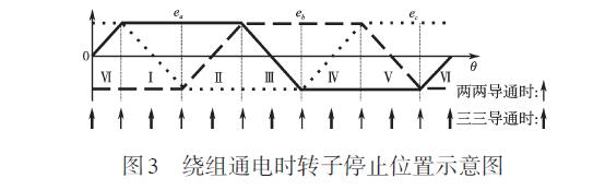T =eaia + ebib + ecicω式中:ea ,eb ,ec 為三相相反電勢;ia ,ib ,ic 為三相相電流;ω 為電機角速度。空載時,在電機繞組中通以固定電流,電機轉子將轉到某一位置并停止,此時電機產生的轉矩零圖3中,Ⅰ~Ⅵ表示霍耳傳感器將電周期分成的6 個區域,當兩兩導通時,通電的兩相繞組電流大小相等,方相反,電機轉矩為零的點分布在各個區域的邊界上;當采用三三導通時,三相繞組均通電,若電流最大相的電流為I,那么其它兩相電流為-I/2,此時電機轉矩為零的點分布在各個區域的中間位置,如圖3 所示。通過以上分析可以知道,要使轉子轉到某一個區域,采用三三導通的方法要比兩兩導通的方法更加合理。
