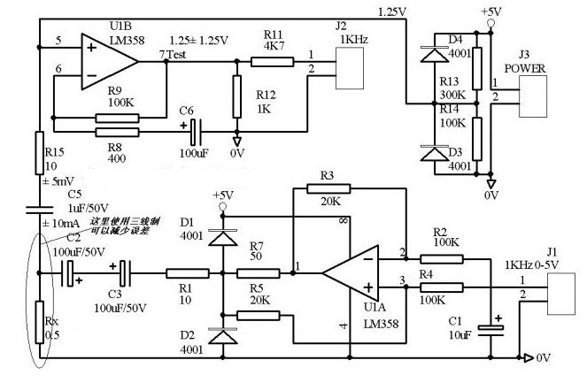 原理:由M8產(chǎn)生1KHz方波,由放大器產(chǎn)生10mA 1KHz交變恒流輸出源,經(jīng)過測試電阻后,產(chǎn)生交變電壓信號經(jīng)過250倍放大,再由M8的快速同步相移ADC檢出值。