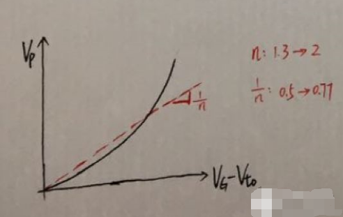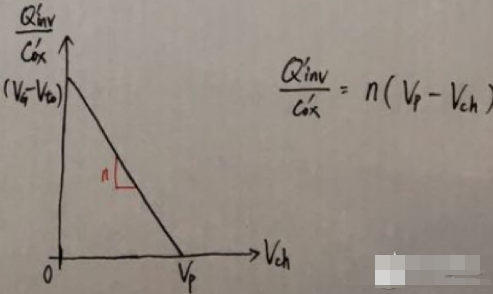 根據(jù)以上的近似,可以畫出Qinv’和Vch的關(guān)系。當Vch = Vp時,溝道被夾斷,電荷密度為0;當Vch = 0時,Qinv’ = Cox’*(VG – Vt0)。細心的童鞋們可能已經(jīng)注意到,下圖的關(guān)系式與之前所列的平行班電容器的公式略有偏差,原因就是之前的公式是在忽略勢壘電容Cdep的效應(yīng),或者說在n = 1的條件下推出的。