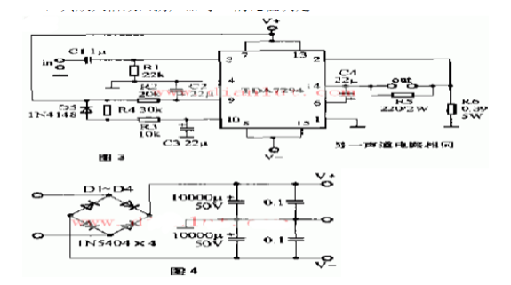 恒流功放電路見(jiàn)圖3,整流電路見(jiàn)圖4。本功放電路與前面兩種結(jié)構(gòu)有些不同,其反饋電路為電流取樣、電壓求和負(fù)反饋。這種電路結(jié)構(gòu)就是人們常說(shuō)的恒流功放,電路的具體分析不作詳述,只介紹與傳統(tǒng)恒壓功放相比后較突出的優(yōu)點(diǎn)。?