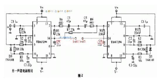 OCL電路圖見(jiàn)圖1,本電路是用兩片TDA7294組成的雙聲道70W?功放。外圍元件少,電路簡(jiǎn)單,當(dāng)電源電壓為土35V時(shí),在8歐負(fù)載上可獲得70W的連續(xù)輸出功率。非常適合30平方米以下的環(huán)境放音。整流電路見(jiàn)圖4,如音箱阻抗小于8歐,電源電壓應(yīng)相應(yīng)降低。