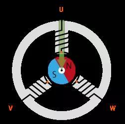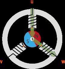 若改變合成磁通量的方向,則永磁體也會隨之改變。配合永磁體的位置,切換 U 相、V 相、W 相中通電的相,以變更合成磁通量的方向。連續(xù)執(zhí)行此操作,則合成磁通量將發(fā)生旋轉(zhuǎn),從而產(chǎn)生磁場,轉(zhuǎn)子旋轉(zhuǎn)。