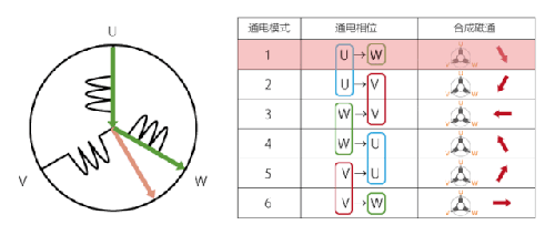 但實際上,U、V、W 的電纜都是互相連接著的,因此無法僅向 U 相通電。在這里,從 U 相向 W 相通電,會如圖 2-C 所示在 U、W 產(chǎn)生磁通量。合成 U 和 W 的兩個磁通量,變?yōu)閳D 2-D 所示的較大的磁通量。永磁體將進行旋轉(zhuǎn),以使該合成磁通量與中央的永磁體(轉(zhuǎn)子)的 N 極方向相同。