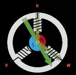 圖 3:轉(zhuǎn)子的永久磁石會像被合成磁通量牽引一樣旋轉(zhuǎn),電機的軸也會因此旋轉(zhuǎn)