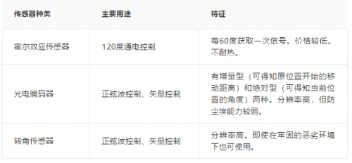 表 1 中顯示的是 BLDC 電機主要的位置檢測用傳感器的種類。根據(jù)控制方式的不同,需要的傳感器也是不同的。在 120 度通電控制中,為判斷要對哪個相通電,配備了可每 60 度輸入一次信號的霍爾效應(yīng)傳感器。另一方面,對于精密控制合成磁通量的“矢量控制”(在下一項中說明)來說,轉(zhuǎn)角傳感器或光電編碼器等高精度傳感器較為有效。