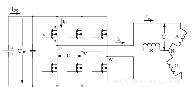 在電機控制器的設計過程中,對功率器件MOSFET的漏極電流 I D 進行校核計算是一項重要工作。這里把我自己的一些推導過程做簡單敘述,主要針對某型車用電機所匹配的電機控制器,功率器件為N-MOS,交流端輸出波形為正弦波,并且假設調制比 m = 1。下文里面出現(xiàn)的變量均如題圖所示。