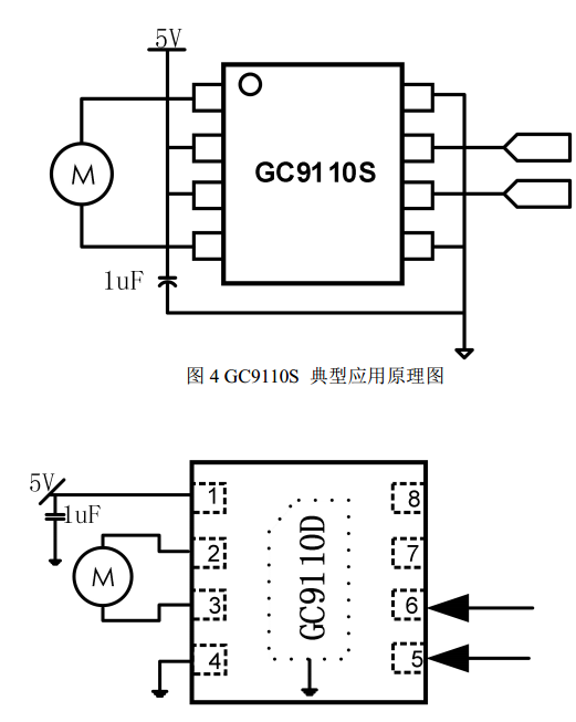 電機驅動解決方案。GC9110 能提供高達 1.3A 的持續輸出電流。可以工作在 1.2~7V 的電源電壓上。GC9110 具有 PWM(IN/IN)輸入接口,