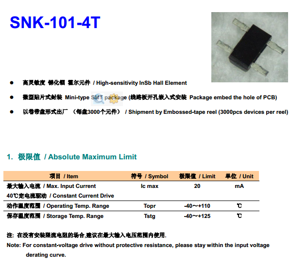 SNK-101-4T,高靈敏度 銻化銦 霍爾元件 / High-sensitivity InSb Hall Element