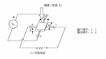 如下圖釋,控制電流由適用厚度的半導體材料d經過端子1和3,在應用磁場之上,帶有磁通密度B垂直于半導體薄片,電位差顯現于端子2和4。VH為霍爾輸出電壓,表示為: