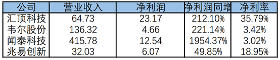 與之形成對比的是 2019 年,匯頂營收 64.73 億,凈利率 35.79%,兆易創新營收 32.03 億,凈利率 18.95%。韋爾股份與聞泰科技因為收購原因凈利潤只有 3%左右,但是凈利率同增卻相當高。