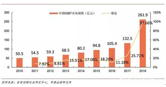 新能源產業的發展,特別是汽車作為最大的消費品開始全面電動化,中國的功率半導體廠商們趕上了電氣化的最大一波浪潮。據行業統計機構數據顯示,2018 年國內 IGBT 市場規模達 261.9 億元,較 2017 年的 132.5 億元大增 97.66%。