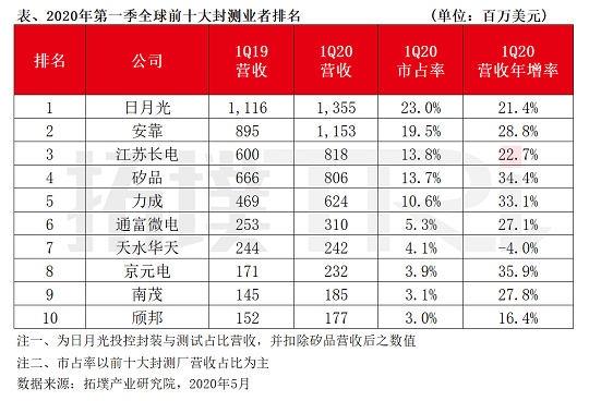 2020年第一季全球前十大封測(cè)業(yè)者營(yíng)收排名出爐
